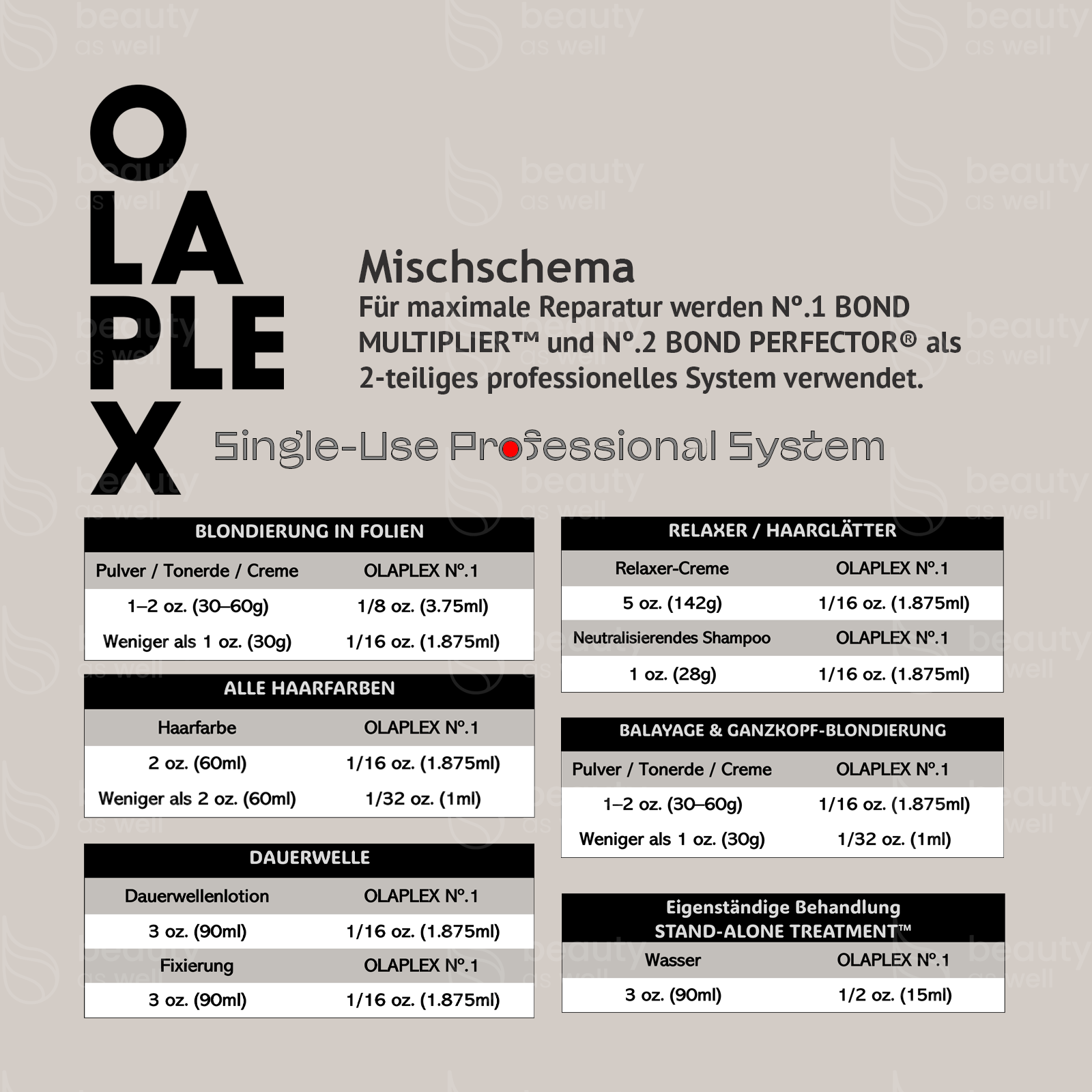 - Ganzfaerbung: Halbe Dosis Nº.1 pro 2 oz Farbe; Nº.2 nach dem Ausspuelen anwenden.