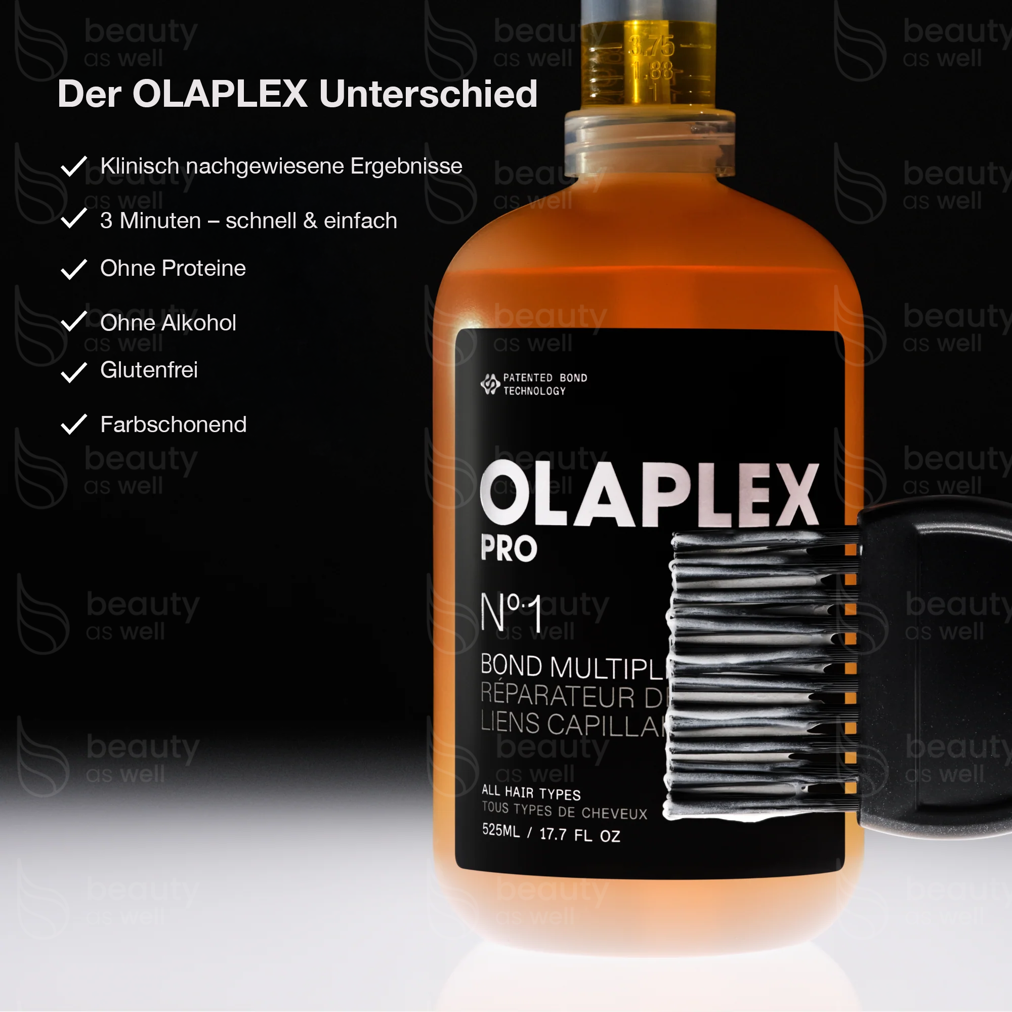 Fuer den kompletten Backbar-Workflow (inklusive Praezisionspumpe und professioneller Mischchart) empfehlen wir das OLAPLEX PRO Original Bond Building Kit (3x525ml). Auch erhaeltlich in einer kleineren Groesse zum flexiblen Nachkauf: 100ml.