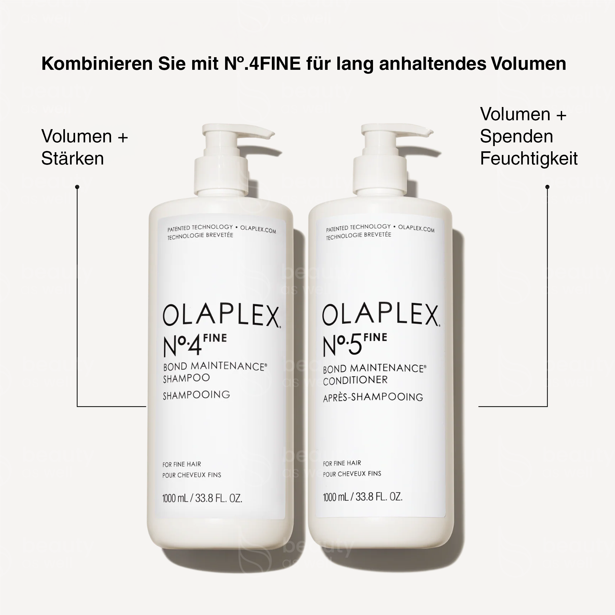 OLAPLEX No.5 FINE Bond Maintenance Conditioner - 1000 ml ist ein leichter Bond-Repair-Conditioner für feines, empfindliches Haar. Stärkt, hydratisiert und verleiht Volumen ohne zu beschweren. Vegan und farbsicher für die tägliche Anwendung.