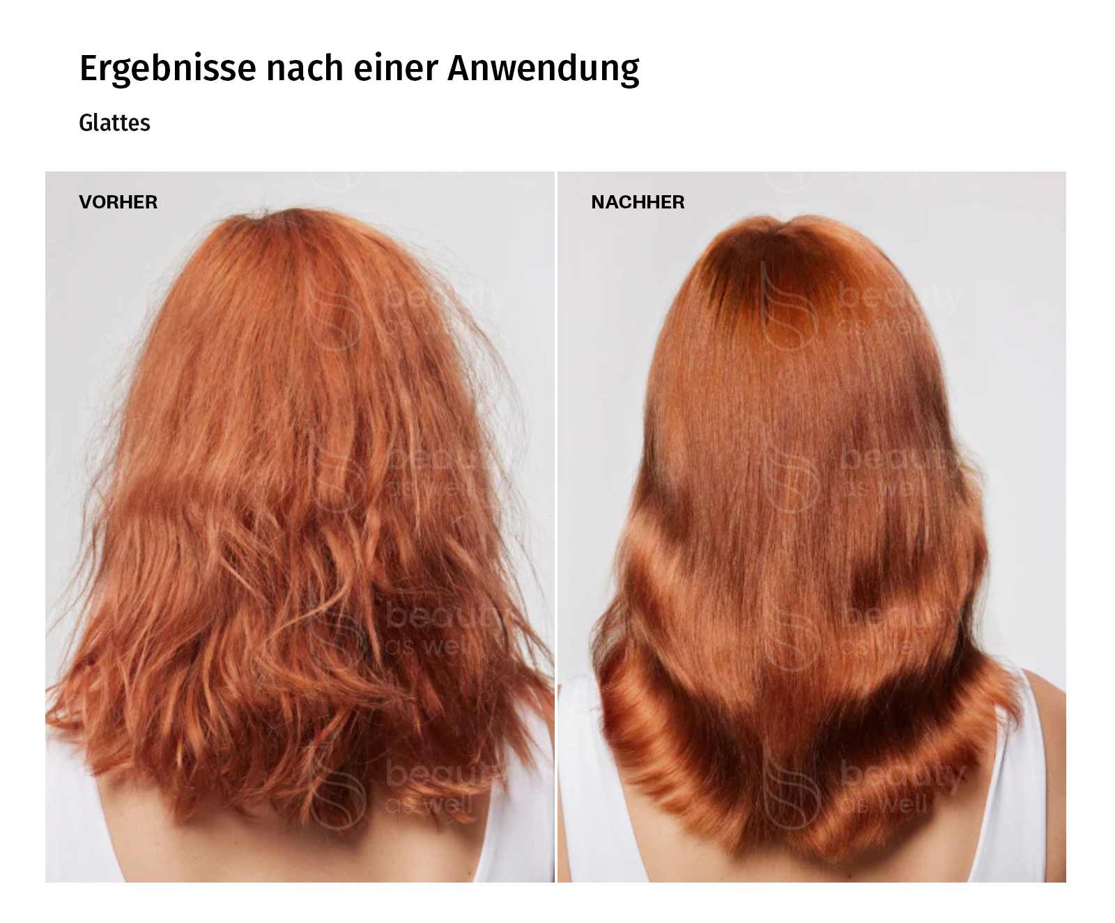 Bei wöchentlicher Anwendung verbessern sich sichtbar Optik und Gefühl des Haars. Die meisten Anwenderinnen und Anwender bemerken schon nach wenigen Anwendungen eine glattere Textur, mehr Glanz und einfacheres Styling.