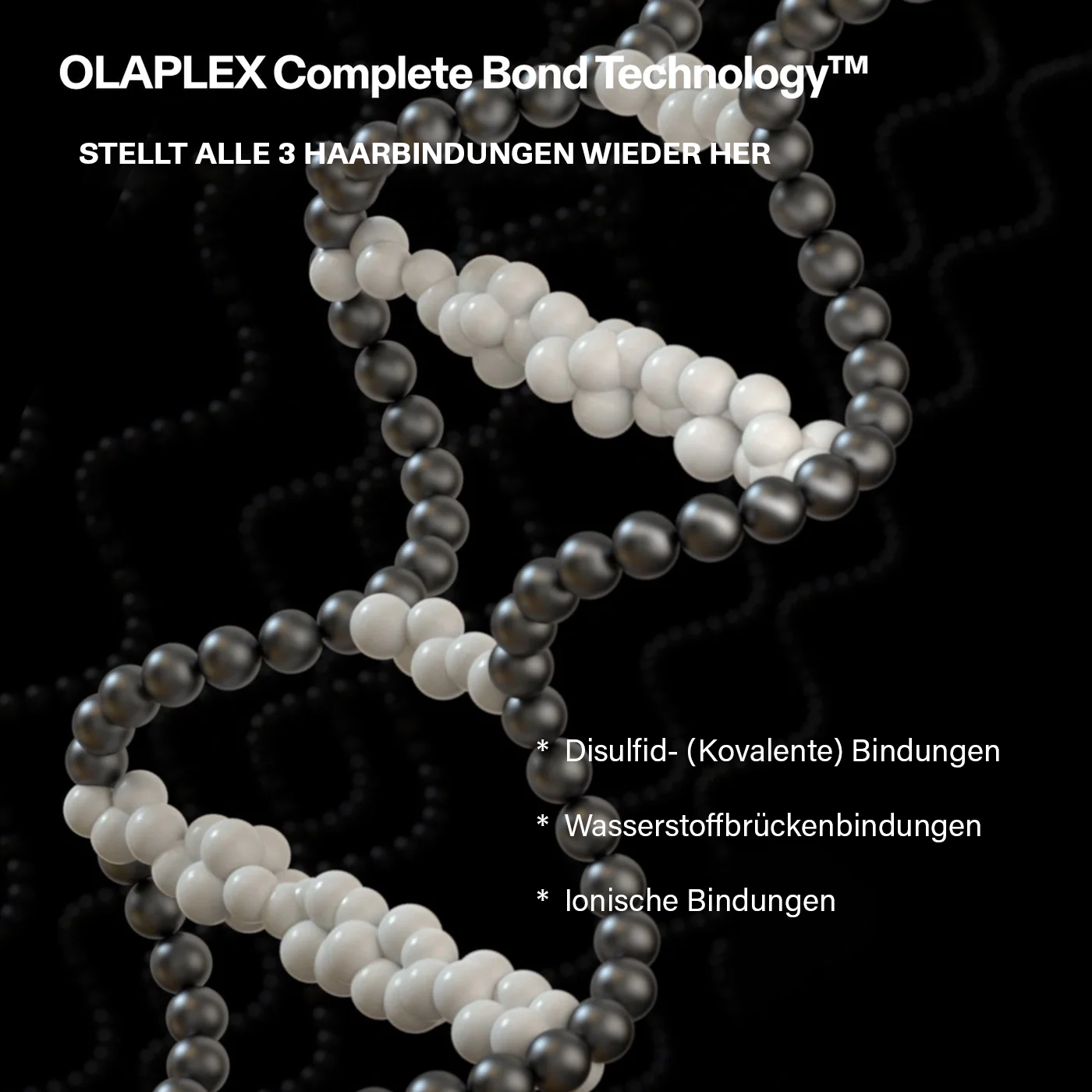 Mit der OLAPLEX Complete Bond Technology und dem patentierten Bis-Aminopropyl Diglycol Dimaleate arbeitet dieses professionelle 2-Stufen-System auf molekularer Ebene. Es unterstuetzt das innere Bindungsnetzwerk des Haares bei chemischem, thermischem und mechanischem Stress, baut Bindungen wieder auf und erhaelt die Faserintegritaet, ohne die Einwirkzeit zu verlaengern.