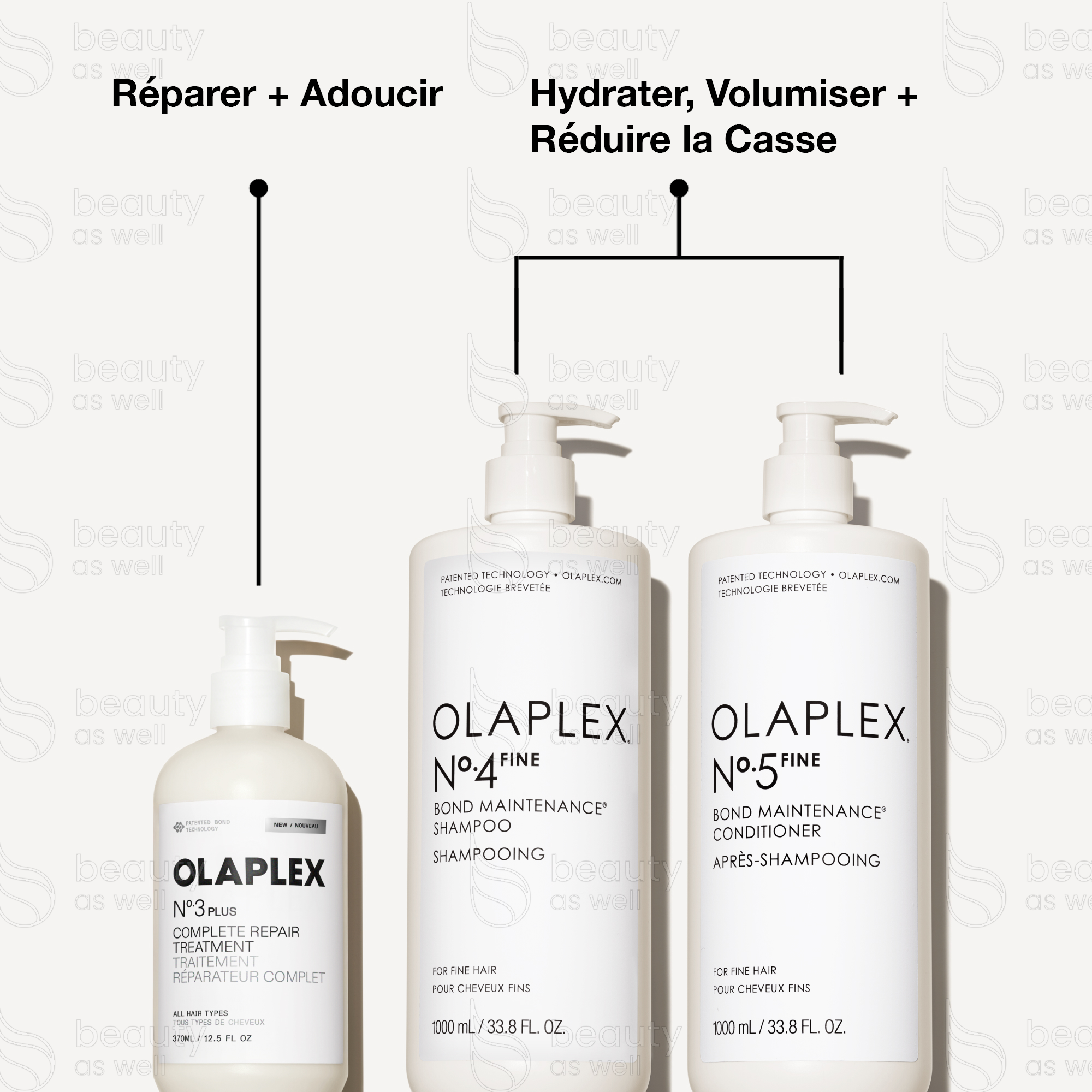 La routine parfaite pour les cheveux fins, plats ou mous qui ont besoin de reparation sans alourdissement. Commencez avec No.3 Plus Traitement Reparateur Complet comme soin pre-shampooing reparateur, continuez avec No.4 Fine Bond Maintenance Shampoo 1000ml pour hydrater et apporter du volume, puis terminez avec No.5 Fine Bond Maintenance Conditioner pour volumiser et reduire la casse.