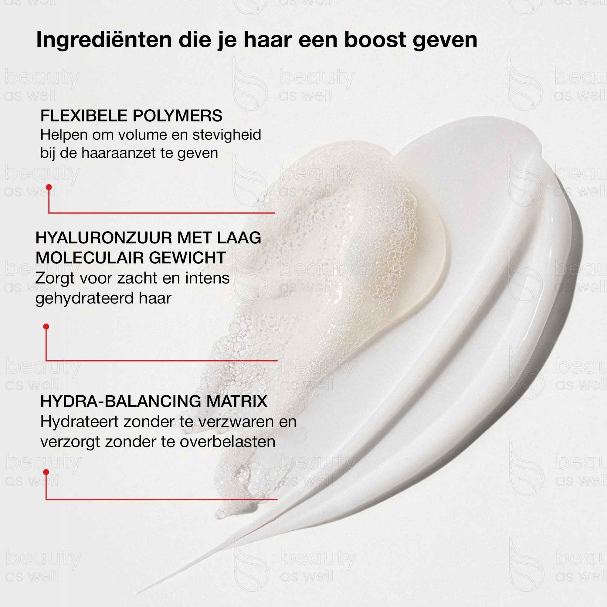 - Hyaluronzuur met laag molecuulgewicht – hydrateert fijne haarvezels zonder te verzwaren
