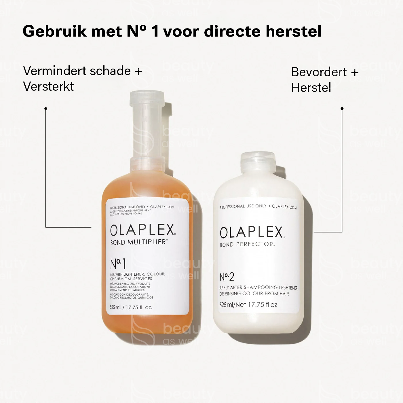 Pro Tip: Breng Nº.2 Bond Perfector royaal aan na Nº.1 Bond Multiplier, laat minimaal 10 minuten intrekken voor volledig herstel van de haarbruggen.