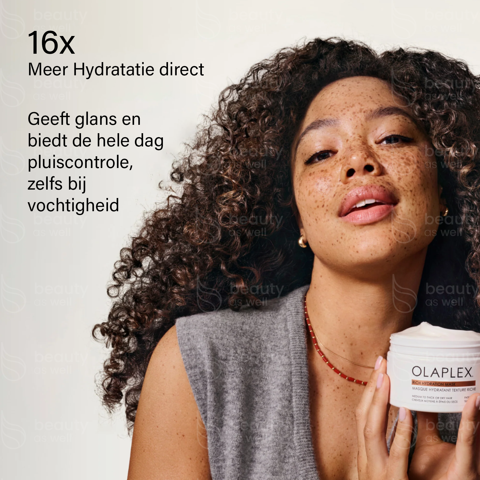 OLAPLEX Rich Hydration Mask is een intens voedend haarmasker dat hydratatie geeft, haarschubben sluit en pluis temt in enkele minuten. Perfect voor droog of grof haar dat meer zachtheid, glans en makkelijker doorkambaarheid zoekt.