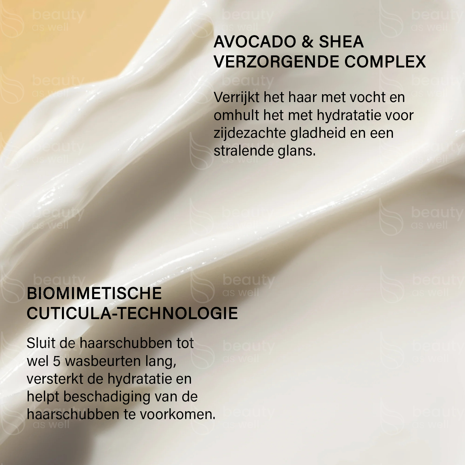 - Avocado & Shea Complex – Plantaardige oliën en boters van verschillende moleculaire gewichten zorgen voor hydratatie en glans zonder siliconen.