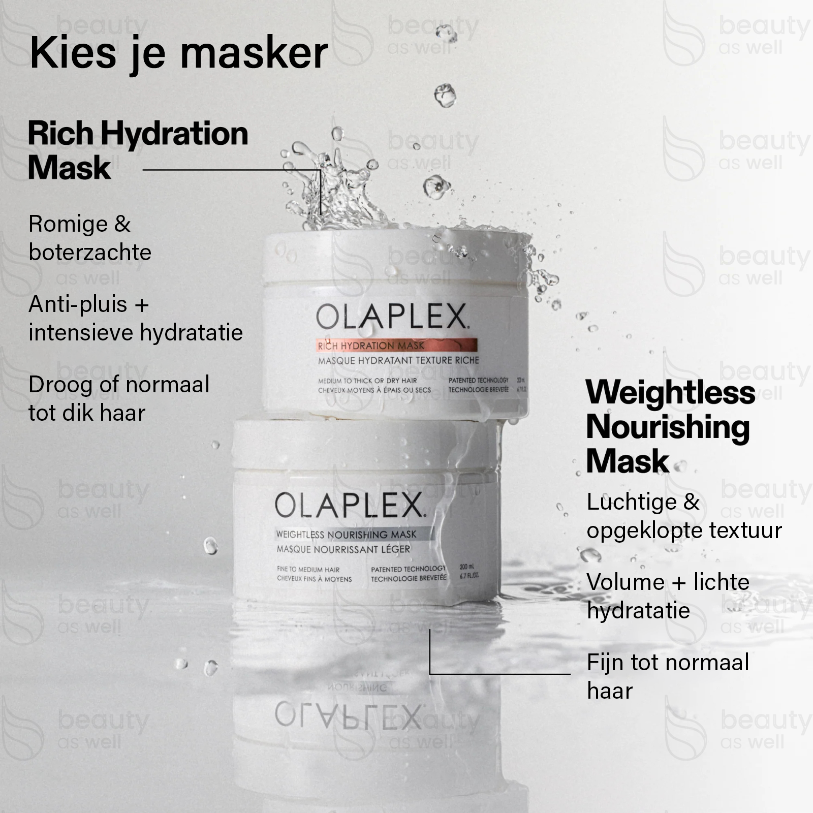 Pro Tip: Voor dik of zeer droog haar, verdeel in secties en kam door voor een gelijkmatige verdeling. Voor fijn tot medium haar gebruik je het OLAPLEX Weightless Nourishing Mask voor volume én hydratatie.