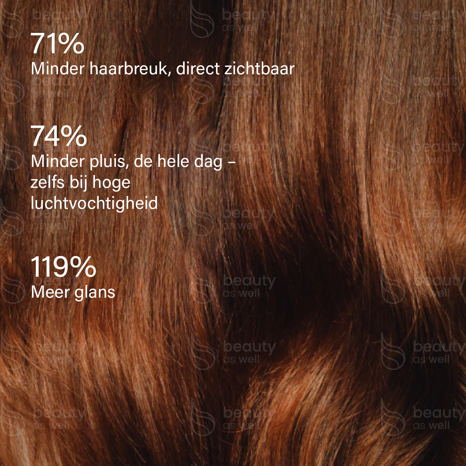 Directe doorkambaarheid, 16x meer hydratatie, tot 71% minder breuk, 74% minder pluis en 119% meer glans die tot 5 wasbeurten zichtbaar blijft.